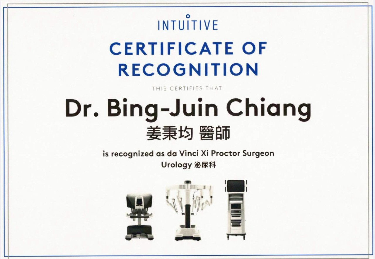 本院泌尿科-姜秉均主任,榮獲成為直覺公司認證 「泌尿科達文西手術指導醫師(da Vinci Xi Proctor Surgeon, Urology)」 此項殊榮為對姜主任專業實力與臨床表現之高度肯定,展現其於達文西機械手臂手術領域之專業技術與豐富經驗,並具備擔任手術指導醫師之資格,協助培育泌尿科醫療人才;同時亦彰顯本院於泌尿科微創手術領域之卓越醫療品質