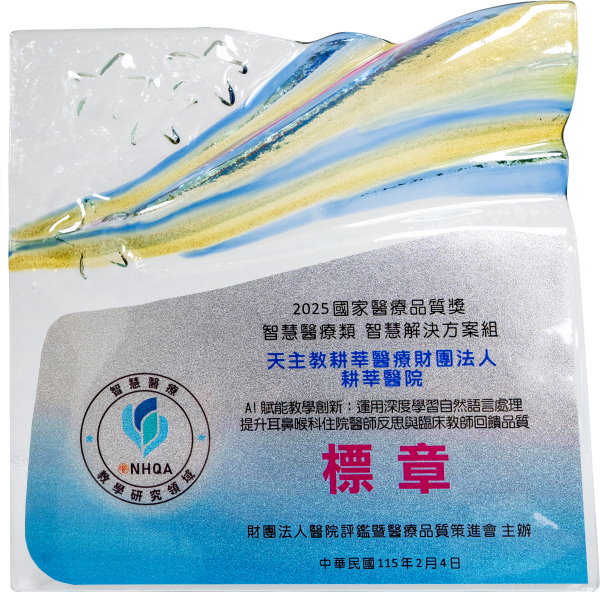 本院耳鼻喉科團隊以「AI 賦能教學創新:運用深度學習自然語言處理提升耳鼻喉科住院醫師反思與臨床教師回饋品質」榮獲智慧醫療類【智慧解決方案組-教學研究領域】標章。