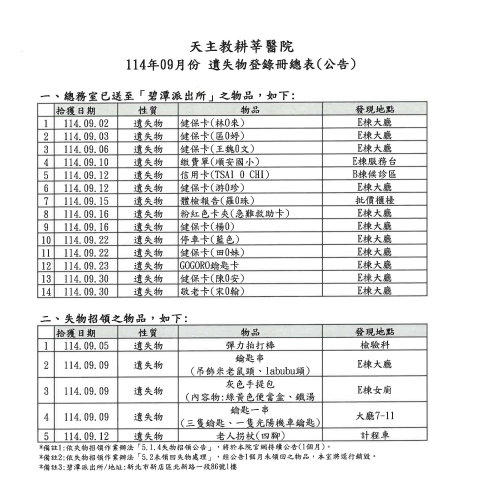 2025-10-09 114年9月份 遺失物登錄冊總表(新店耕莘)