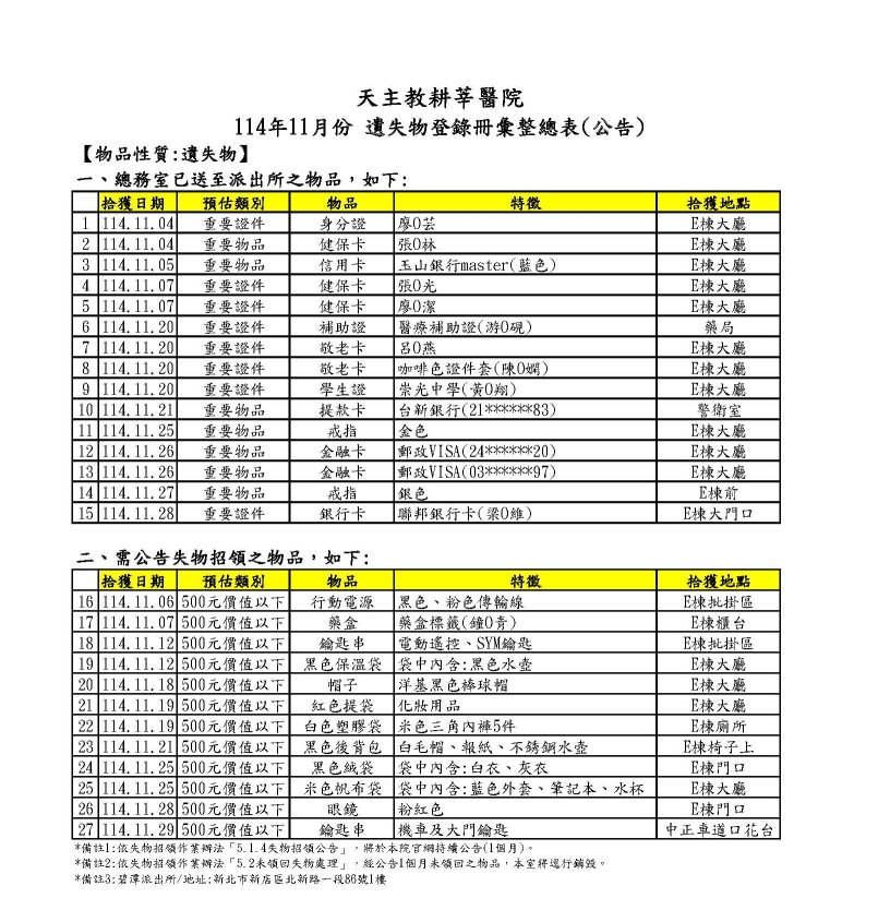 2025-12-05 114年11月份 遺失物登錄冊總表(新店耕莘)