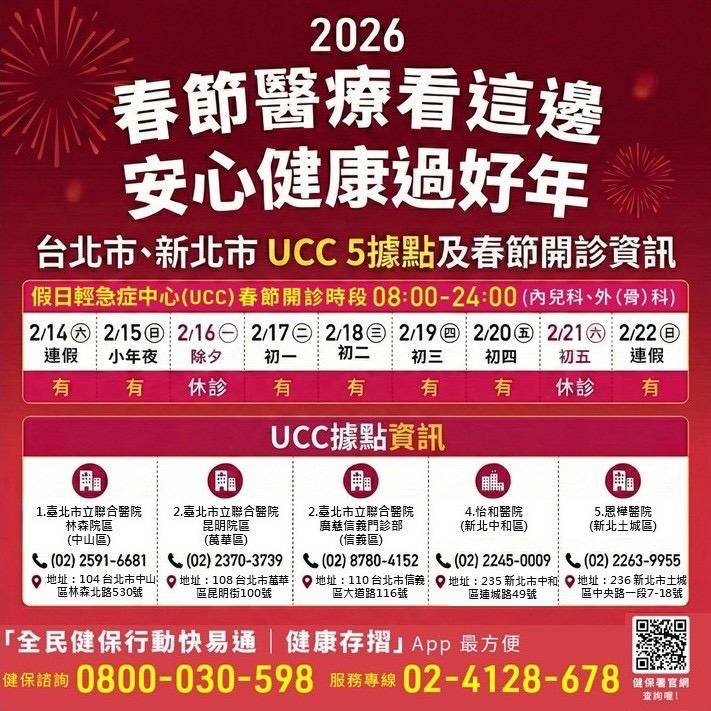 UCC春節開診時段 (2/14 - 2/22) • 開診日: 2/14(六)-2/15(日)、2/17(二)-2/20(五)、2/22(日) • 休診日: 2/16 (除夕) 及 2/21 (初五) • 服務時間: 08:00 - 24:00 就醫需求指引(內、兒、外、骨科) • 發燒、 • 呼吸道/腸胃道症狀、 • 小兒急性不適、 • 簡單傷口處理 至 UCC 看診分流,更省時便利!