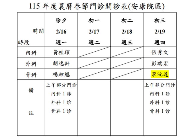 2026-02-16、19 (除夕、初三)本院區開設農曆春節門診(安康院區)