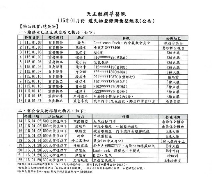 2026-02-05 115年1月份 遺失物登錄冊總表(新店耕莘)