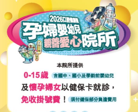 一、指導單位:衛生福利部 二、主辦單位:社團法人中華民國牙醫師公會全國聯合會 三、活動主題:「兒童口腔健康週-孕婦嬰幼兒親善愛心院所」 四、活動目的:宣導口腔保健相關政策,並配合兒童節活動,鼓勵提升懷孕婦女及兒童口腔保健服務利用,養成定期看牙醫之保健習慣。口腔保健應從小做起,「從小保護牙,老來不缺牙」! 五、時間:115年4月1日(三)至4月15日(三)。 六、對象:懷孕婦女及0-15歲(國中、國小及學齡前嬰幼兒) 七、內容:本活動不收掛號費(僅收健保部份負擔)