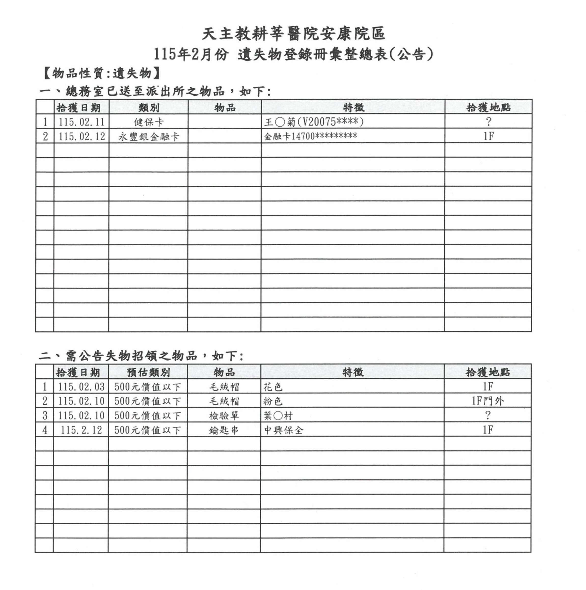 2026-03-10 115年2月份 遺失物登錄冊總表(新店耕莘)