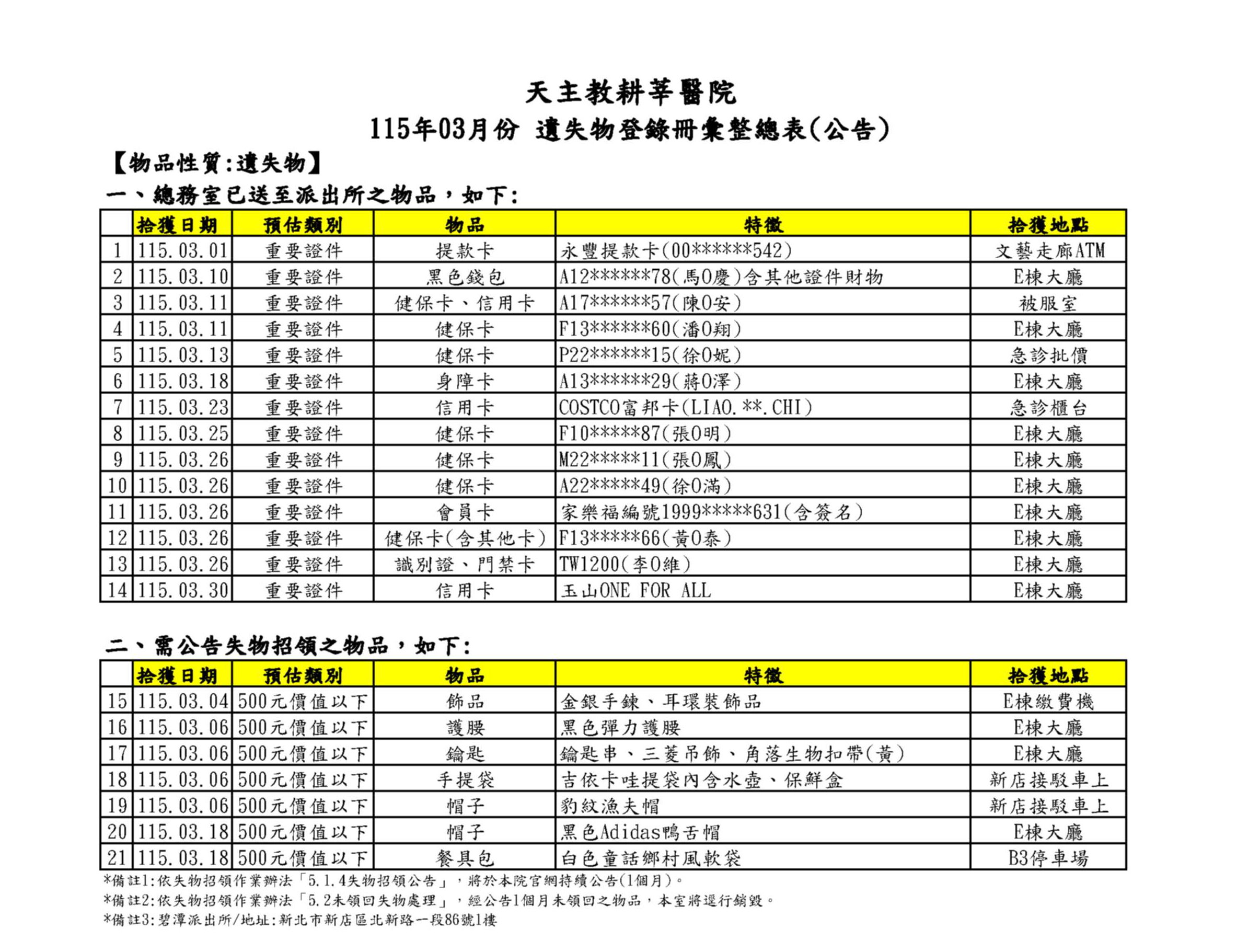 2026-04-09 115年3月份 遺失物登錄冊總表(新店耕莘)