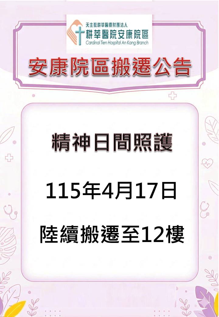 2026-04-17 精神日間照護陸續搬遷至安康院區12樓(醫院整建工程)