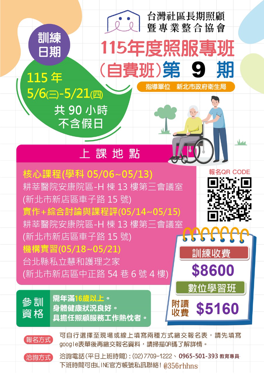 因應高齡化社會發展與長照人力需求提升,耕莘醫院將於安康院區辦理「照顧服務員訓練專班」,歡迎對長期照顧服務有興趣的民眾踴躍報名,一同投入照顧服務行列!