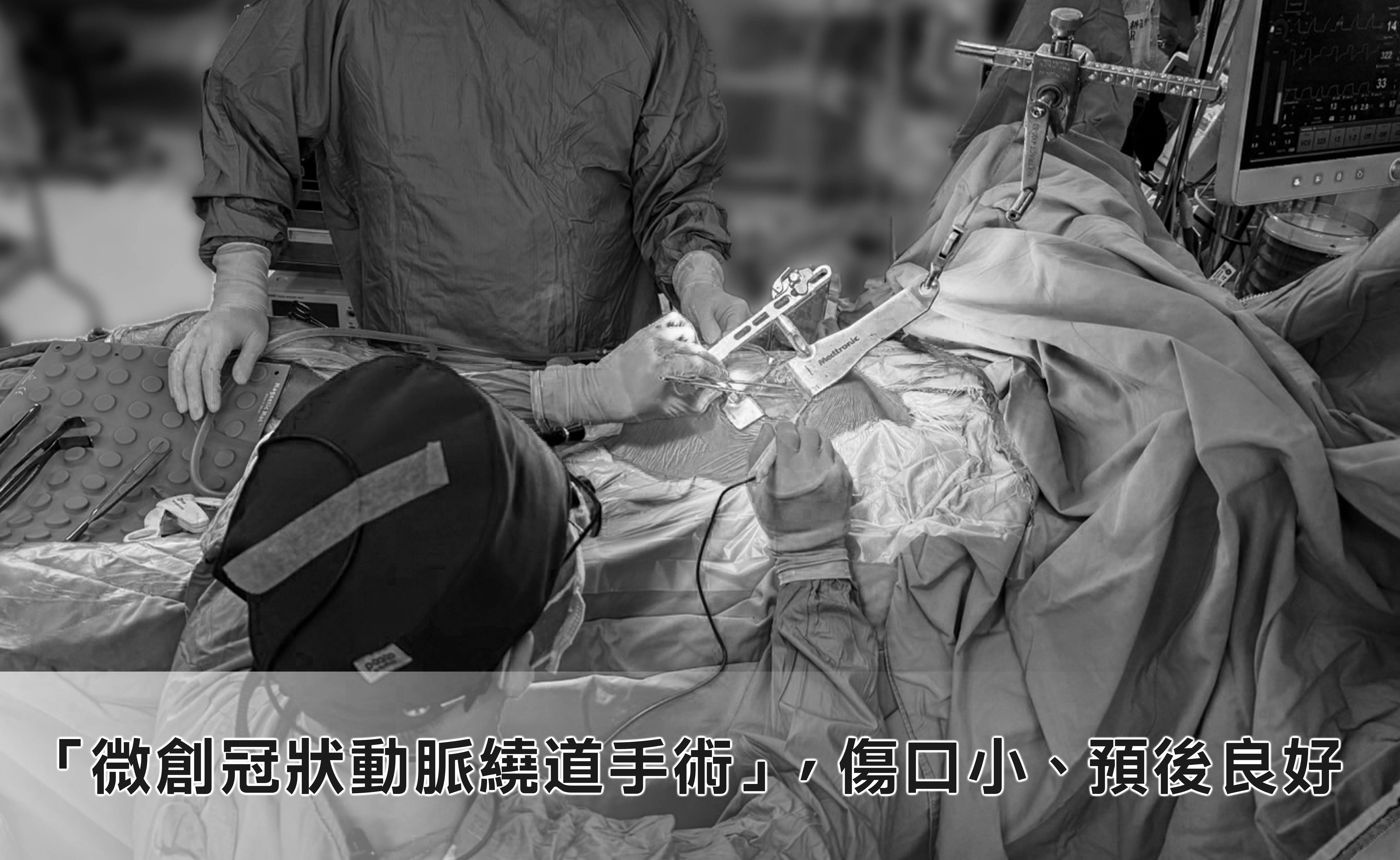 「微創冠狀動脈繞道手術」係以內視鏡輔助,利用健康的動脈或靜脈作為繞道的通道,將擷取下來的動脈或靜脈,從主動脈處連接到阻塞血管分支的心臟表面接點,使血液繞過狹窄或阻塞處能夠流通,供應心臟肌肉所需的養分。