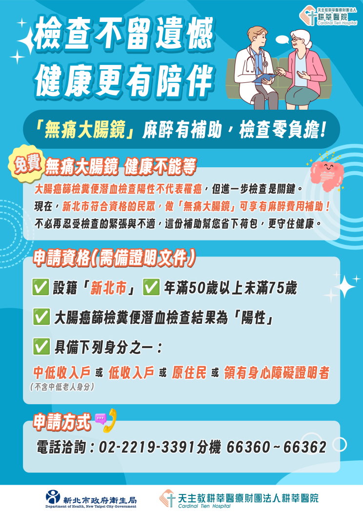 現在,新北市符合資格的民眾,做「無痛大腸鏡」可享有麻醉費用補助!