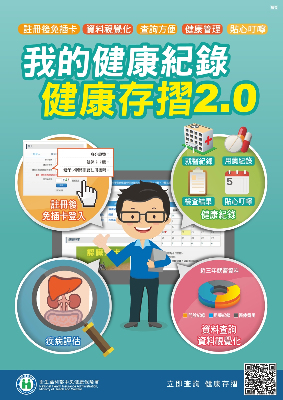 「全民健保健康存摺」系統已於103年9月底上線,「健康存摺」提供民眾最近一年內之個人就醫資料,包括:門住診院所名稱、就醫及住院日期、疾病名稱、醫療處置及手術、藥品及醫療材料、檢查及檢驗、醫療費用及保費等。民眾透過網路,用自然人憑證或健保卡,即可申請下載自己的「健康存摺」,就醫時提供醫師參考,提升醫療安全與效益。 二、「健康存摺」好站連結(網址:https://med.nhi.gov.tw/ihke0000/IHKE0100S01.aspx 。 進入網站 更多內容>>> 衛生福利部中央健康保險署臺北業務組醫務管理科 敬啟