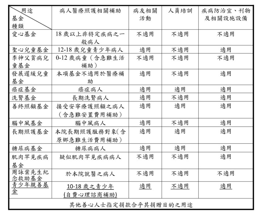 本院於民國八十一年起,正式設立各項捐款專戶,以提供病患經濟上的補助,包括有: