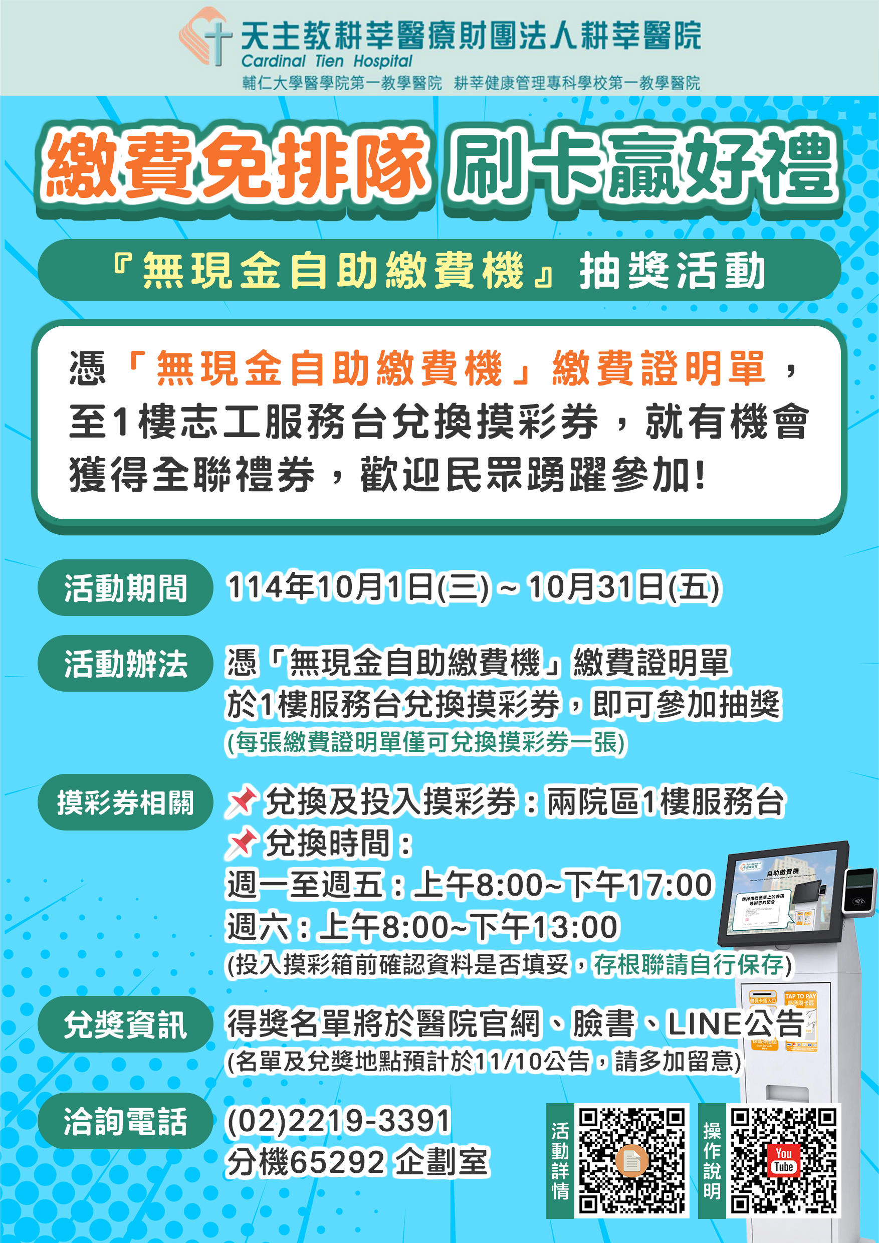 憑「無現金自助繳費機」繳費證明單,至1樓志工服務台兌換摸彩券,就有機會獲得全聯禮券,歡迎民眾踴躍參加!...更多內容>>>